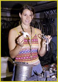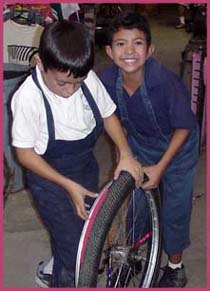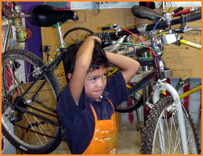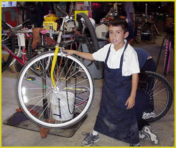 We conduct a series of hands-on classes every Thursday and Saturday at 4:00 p.m. and 1:00 p.m., respectively, that teach folks of all ages the art of bike-ology. Once a student completes a good portion of our bicycle maintainence and repair course work, he or she has the opportunity to build a bike out of our stash o' used parts to ride, love, and keep. Classes are available to the public for a nominal sliding-scale fee. We also have programs in conjuction with local schools to teach kids the trade of bicycle mechanics. Here, they not only receive the hands-on training, but they also receive classroom credits as well. We have even taken the trade school on the road to a neighborhood center in Phoenix, and to middle schools in Mexico. |